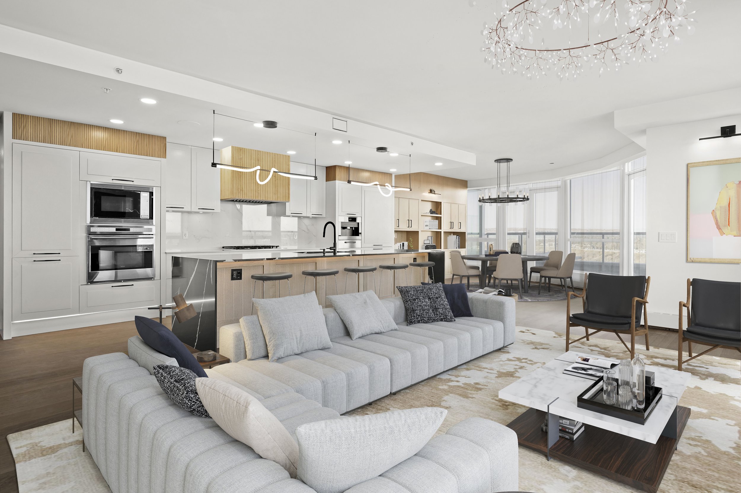 The Riverfront Penthouse blends refined urban living with the tranquility of a riverside retreat. Located in Calgary’s Eau Claire district, this light-filled space features bespoke finishes, natural textures, and sweeping Bow River views. Clean lines and an open layout bring a sense of calm and sophistication to every room.